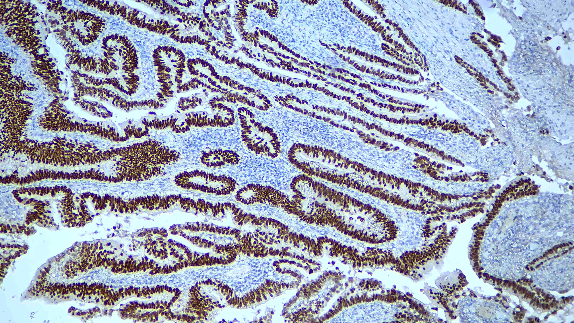 Special AT-rich sequence-binding protein 2 (SATB2) is a recently described marker that functions as a nuclear matrix-associated transcription factor. It has been reported that SATB2, in combination with CK20, could identify almost all colorectal carcinomas, including poorly differentiated colorectal carcinomas. Upper gastrointestinal (GI) carcinomas and pancreatic ductal carcinomas are usually negative for SATB2, and ovarian carcinomas, lung adenocarcinomas, and adenocarcinomas from other origin are rarely positive for SATB2. Therefore, SATB2 is a good marker for identifying a carcinoma of colorectal origin when working on a tumor of unknown primary. It can help differentiate colorectal metastasis (SATB2+) from primary pulmonary adenocarcinoma of mucinous or enteric type (SATB2- but often CDX2+)